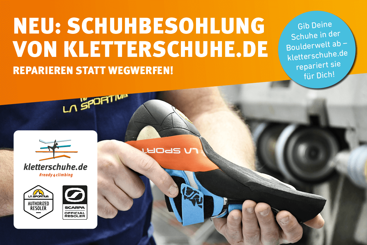 Reparieren statt Wegwerfen! Unser Partner – kletterschuhe.de – bietet Dir die nachhaltige Alternative: Hochwertige und professionelle Neubesohlung Deiner Kletterschuhe! Ab 9. August kannst Du sie direkt bei uns an der Theke abgeben und sparst Dir die Versandkosten!